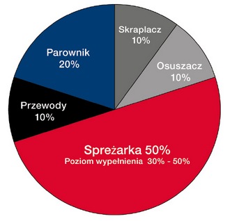Przedstawione na załączonym wykresie kołowym rozmieszczenie oleju w układzie podaje procentowe wartości referencyjne, zależne dodatkowo od temperatury zewnętrznej i obciążenia. Zwykle w sprężarce powinno się znajdować około 30–50% całkowitej ilości oleju. Maksymalna dopuszczalna zawartość barwnika UV nie powinna przekraczać 5% całkowitej ilości oleju.
