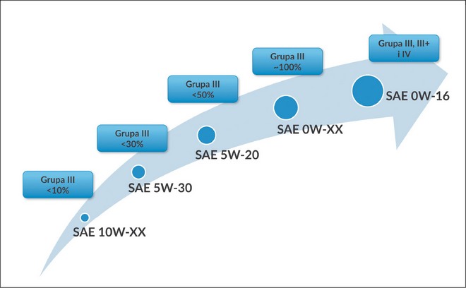 Aby pokazać, jak to wygląda w praktyce, przygotowaliśmy zestawienie (rys. 1) zawartości syntetycznych baz olejowych w olejach "nazywanych w pełni syntetycznymi". Jak widać, większość tych produktów zawiera małą część faktycznie syntetycznych baz olejowych. Dla grupy III API jest to tylko 30–50%, a w przypadku olejów SAE 5W20 i 5W30 – nawet mniej niż 30%.