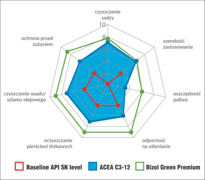 Jedną z najważniejszych cech olejów w pełni syntetycznych jest mocniejszy i bardziej stabilny film olejowy, zapobiegający zużyciu silnika i zmniejszający zużycie paliwa. Ostatni diagram (rys. 4) przedstawia bazowe wymagania API dla olejów silnikowych (czerwona matryca) i (kolor niebieski) dla najpopularniejszej obecnie normy C3 (Diesel, DPF, wydłużony interwał wymiany). W tym kontekście Bizol Green Oil pozostawia konkurencję daleko w tyle.
