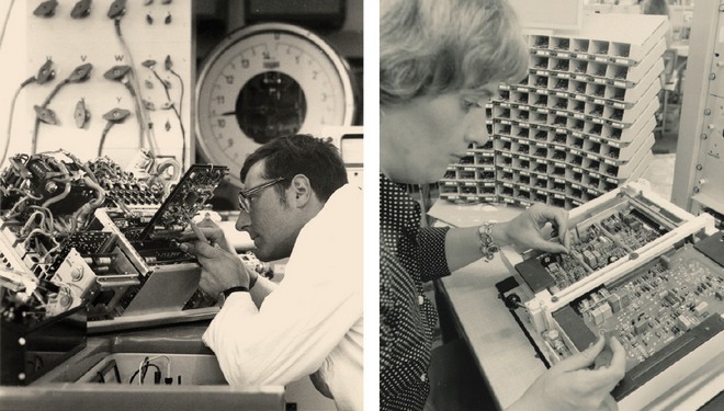 Z lewej: 1970 r. – stanowisko pomiarowe elektroniki sterującej do samochodu elektrycznego; z prawej: 1978 r. – produkcja półprzewodników do elektronicznego systemu wtrysku benzyny Jetronic