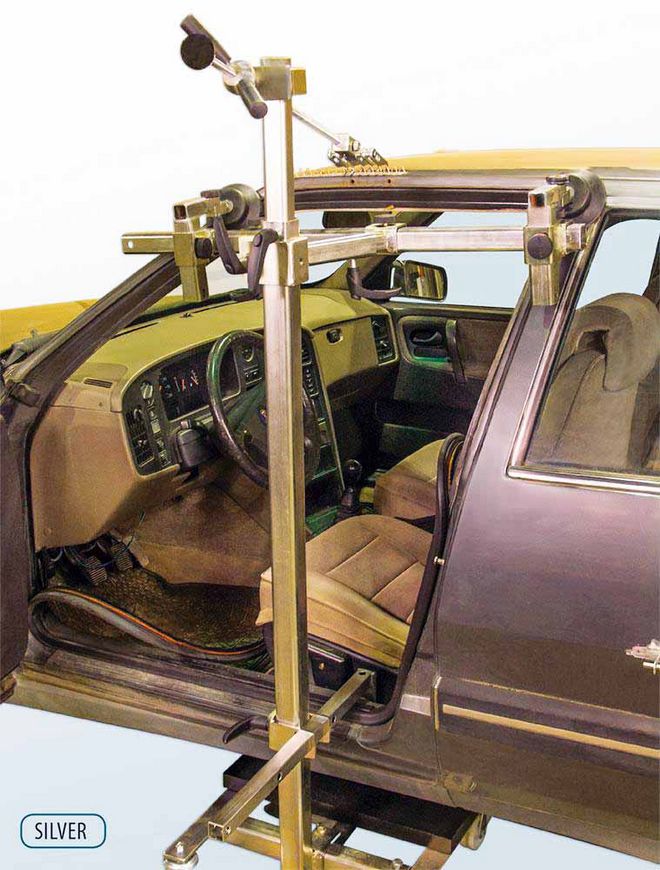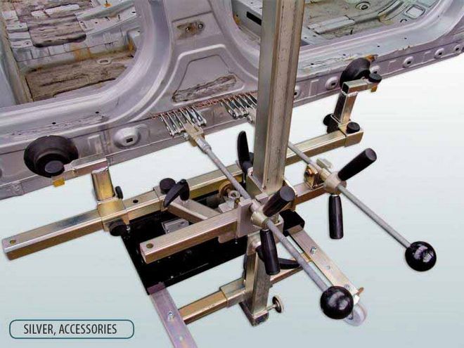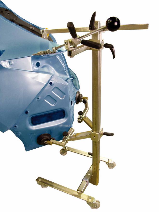 Szybkie prostowanie bocznych powierzchni nadwozia za pomocą SmartPullera opiera się na wykorzystaniu sztywnej, pionowej belki osadzonej na mobilnym wózku (fot. 4). Elementy te tworzą w sumie stabilną podstawę, względem której regulowane są gumowe wsporniki reakcyjne oraz śrubowy naciąg prostujący. Możliwość obrotu wsporników w zakresie 360° czyni prostowanie odkształceń łatwiejszym i szybszym. Szczęki mocujące i inne narzędzia naprawcze mogą być zamontowane na śrubie naciągającej.