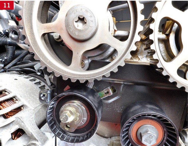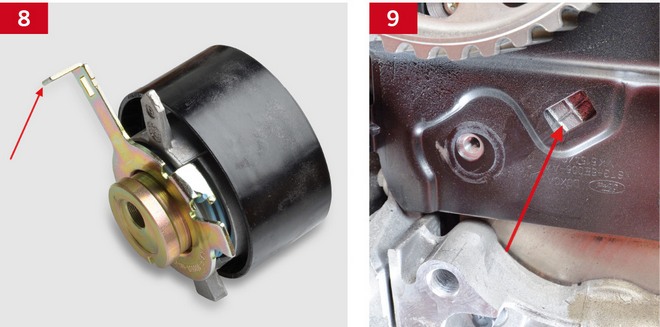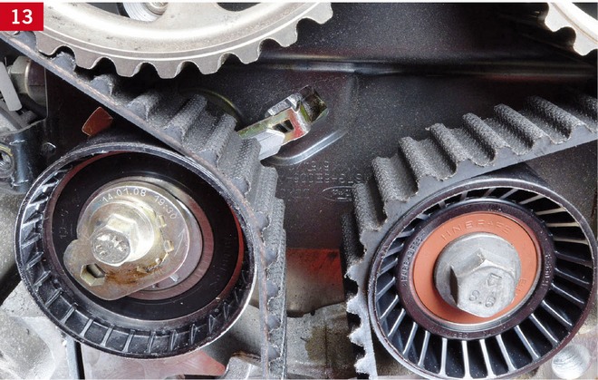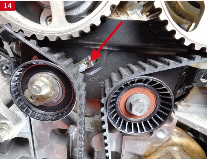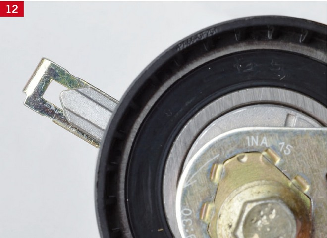 Dalsze napinanie paska rozrządu przeprowadza się za pomocą rolki napinającej, poprzez jej obrót w kierunku przeciwnym do ruchu wskazówek zegara, aż do ustawienia znaków na rolce w jednej linii (zdj. 12, 13, 14). Potem dokręca się śrubę rolki napinającej momentem 25 Nm.