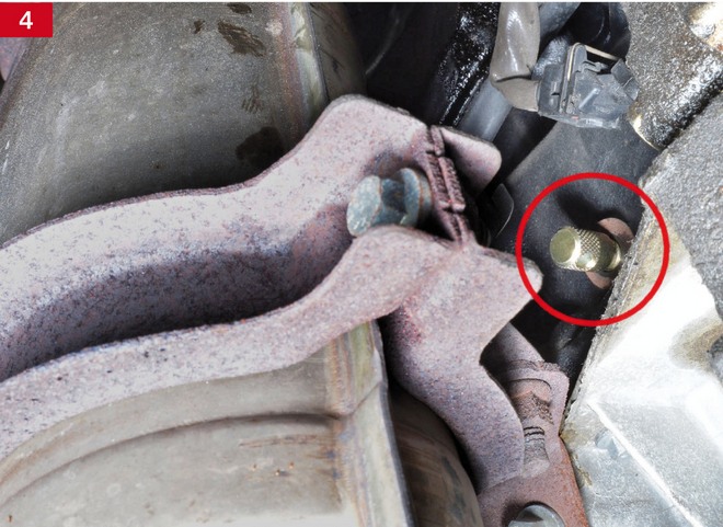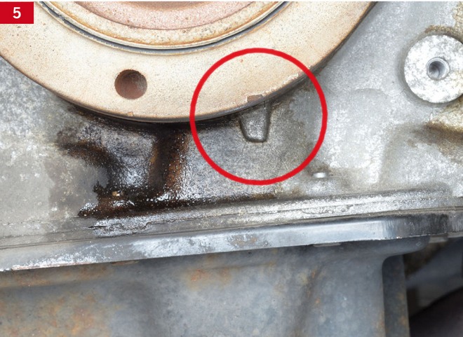 3. zamontować trzpień ustalający wału korbowego OE (303-574) w miejsce wykręconej zaślepki bloku silnika (zdj. 3 i 4), obserwując znaki odniesienia na kole pasowym wału korbowego (zdj. 5);