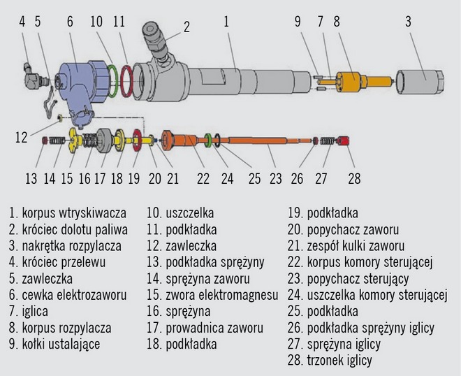 Budowa wtryskiwacza elektromagnetycznego (części oznaczone kolorem czerwonym są elementami regulacyjnymi)