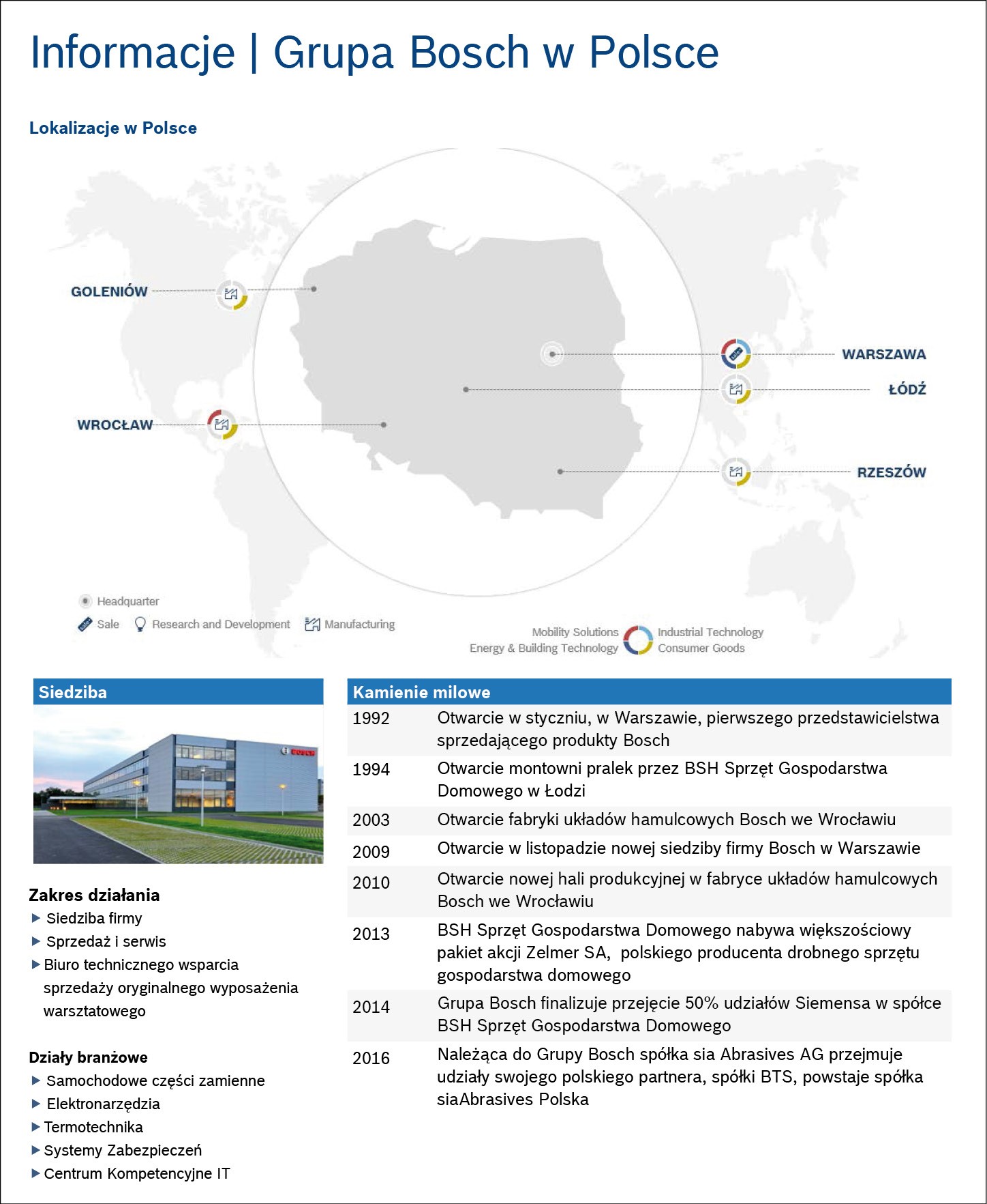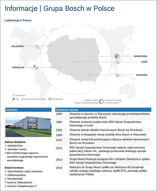BSH posiada w Polsce 4 fabryki działające i 2 w budowie, 3 centra logistyczne i ogólnopolską sieć sprzedaży z fabrycznym serwisem.
