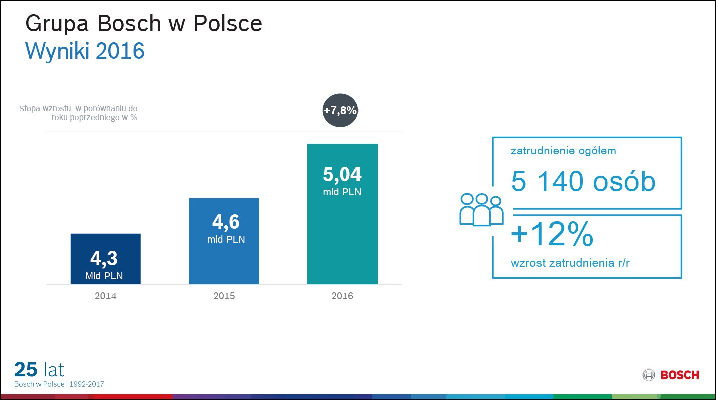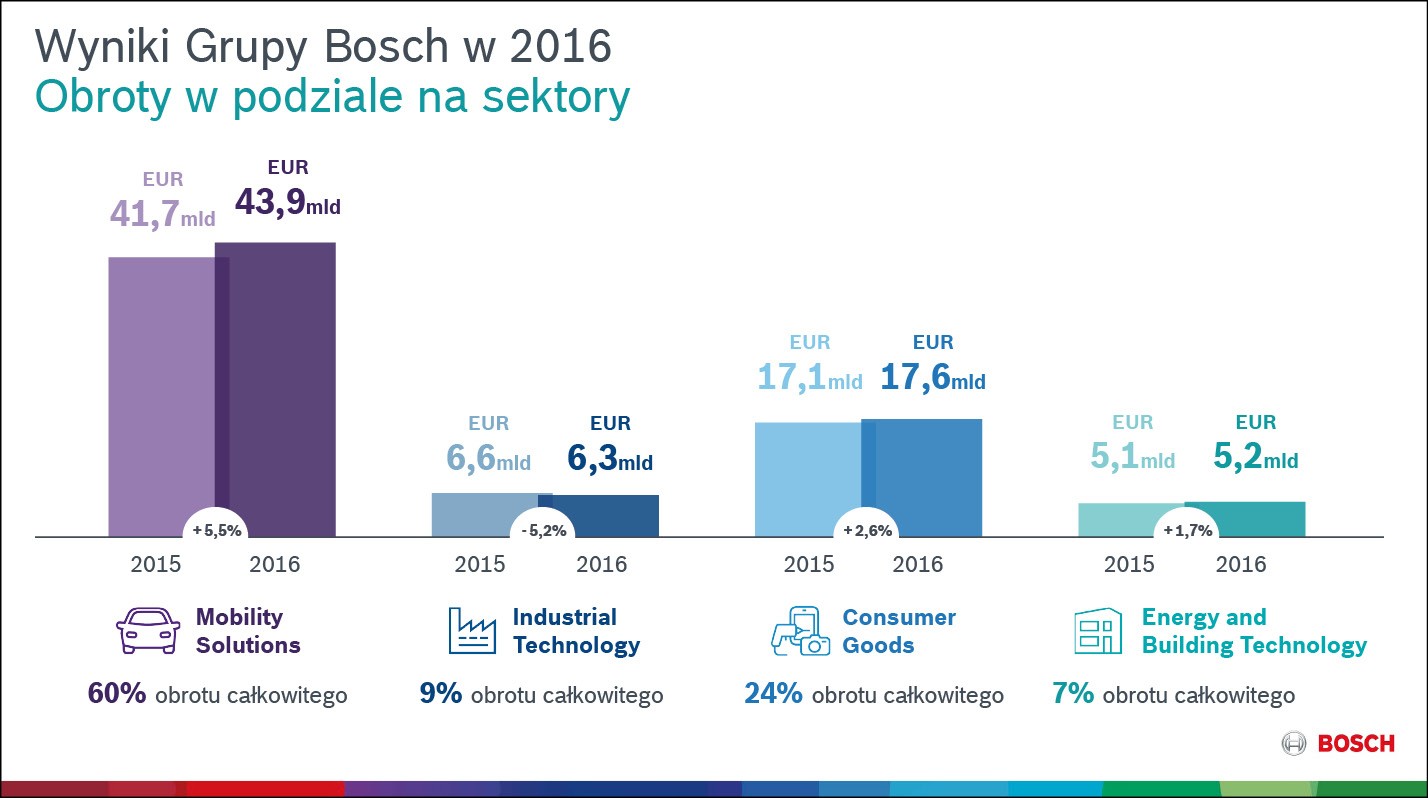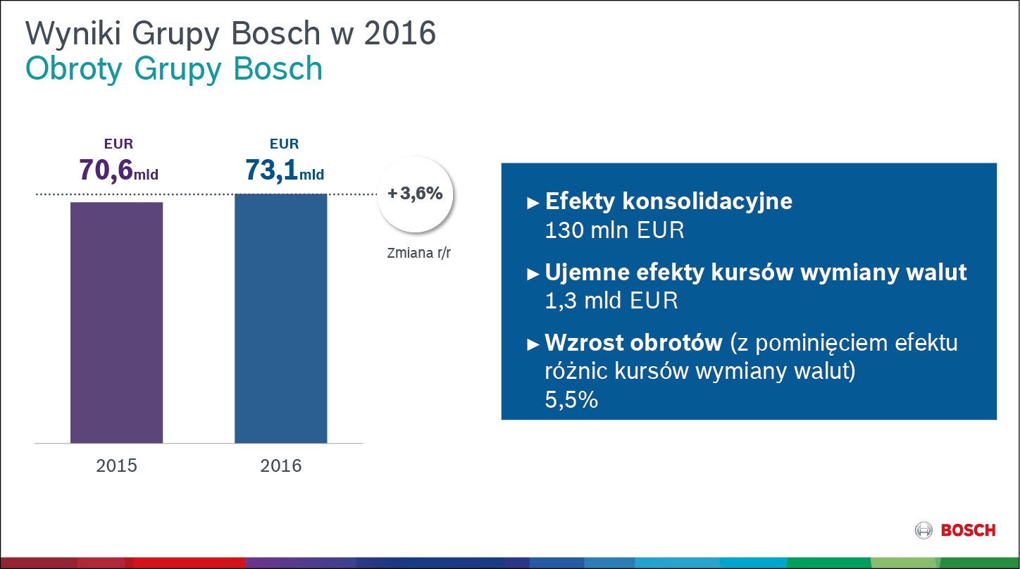 Obroty Grupy Bosch wyniosły w 2016 roku 73,1 mld euro, czyli w stosunku do roku poprzedniego zwiększyły się o 3,6%. W wyniku tym uwzględnione zostały efekty konsolidacyjne w wysokości 130 mln euro, ujemne efekty kursów wymiany walut (1,3 mld euro), a także wzrost obrotów liczony z pominięciem różnic kursów walutowych o wysokości 5,5%.