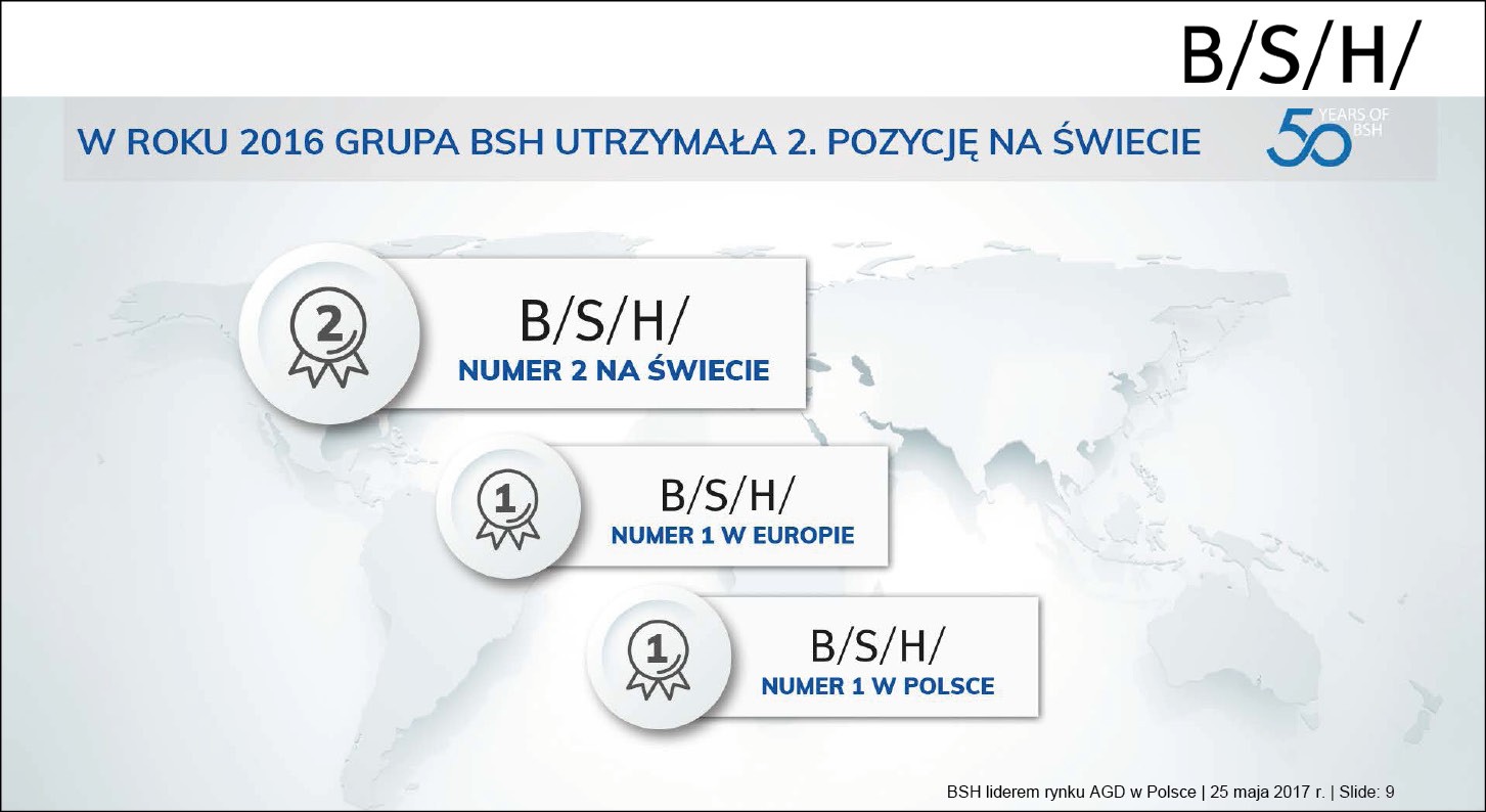 BSH obchodzący właśnie swe 50. urodziny to 40 fabryk, 80 spółek w 50 krajach i 58 300 pracowników na całym świecie. To także 13,1 mld euro obrotu w 2016 roku. Na światowym rynku reprezentują go innowacyjne sprzęty dostępne w obrębie 14 marek.