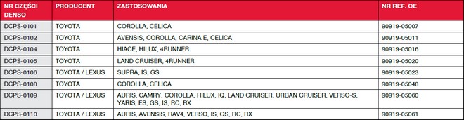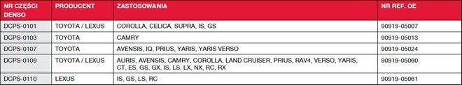 Osiem nowych czujników położenia wału korbowego ma 129 zastosowań i pokrywa zapotrzebowanie 2 mln pojazdów. Z kolei pięć numerów katalogowych czujników położenia wałka rozrządu zapewnia 119 zastosowań i pokrywa zapotrzebowanie 3,5 mln pojazdów. Elementy mają zastosowanie w pojazdach marek Toyota i Lexus.