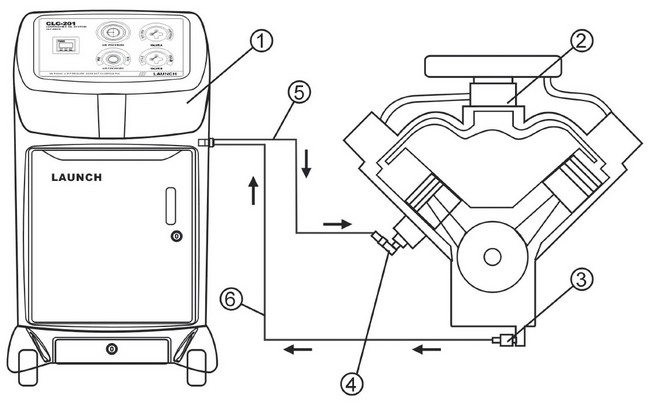Agregat Launch do płukania układów olejowych w silnikach: 1. urządzenie Launch, 2. silnik, 3. miska olejowa, 4. gniazdo filtra, 5. przewód wylotowy oleju, 6. przewód powrotny oleju