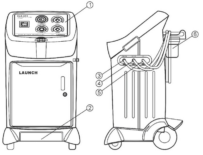 Urządzenie do czyszczenia i płukania układu smarowania: 1. panel sterujący, 2. szuflada, 3. przewód wylotowy oleju, 4. przewód powrotny oleju, 5. wlot powietrza, 6. filtr