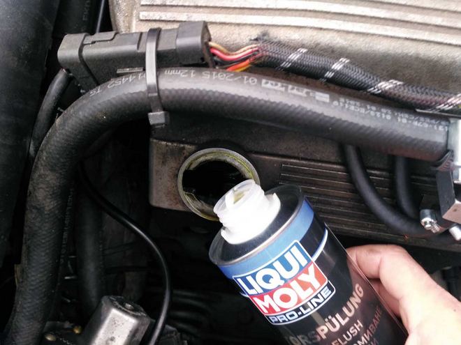 W takim wypadku zawsze lepiej na początku przepłukać układ smarowania płukanką, np. Liqui Moly nr 2662. Dzięki temu pozbędziemy się zanieczyszczeń, które blokują pierścienie tłokowe w rowkach, a także oddalimy potencjalne zagrożenie zatkania kanałów olejowych.