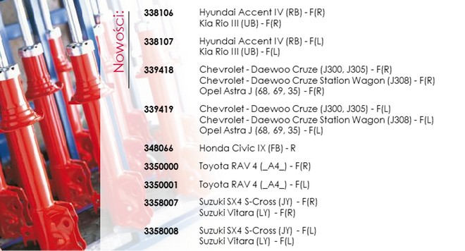 Nowe amortyzatory są przeznaczone do montowania na przednich i tylnych osiach pojazdów marek Chevrolet, Hyundai, Honda, KIA, Opel, Toyota i Suzuki.