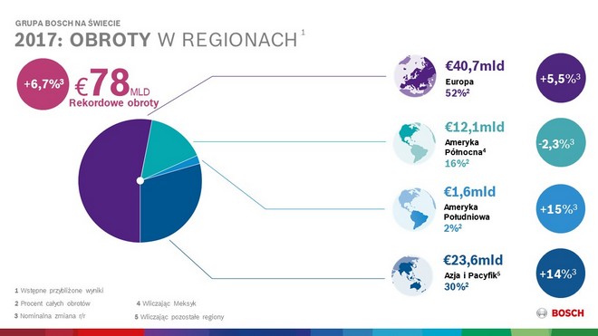 Działalność Grupy Bosch w Europie rozwijała się pomyślnie. Obroty zwiększyły się o 5,5%, do 40,7 mld euro (a z pominięciem efektu różnic kursów wymiany walut o 6,3%). W Ameryce Północnej koncern odnotował wzrost na poziomie z ubiegłego roku (z pominięciem efektu różnic kursów wymiany walut). Obroty osiągnęły próg 12,1 mld euro, jednak nominalnie oznaczało to spadek o 2,3%. Dalsza poprawa koniunktury w Ameryce Południowej przyniosła wzrost obrotów o 15%, do 1,6 mld euro. Z pominięciem efektu różnic kursów wymiany walut obroty wzrosły o 12%. W regionie Azji i Pacyfiku łącznie z Afryką Bosch odnotował silny wzrost obrotów do 23,6 mld euro. W porównaniu do poprzedniego roku wzrost wyniósł 14%; z pominięciem efektu różnic kursów wymiany walut odpowiada to wzrostowi o 17%.
