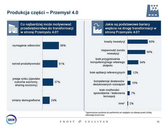 Oceniając kolejny trend, menedżerowie fabryk w Polsce wykazali zrozumienie dla potencjalnych korzyści z wdrażania rozwiązań Przemysł 4.0. Ponad połowa z nich uważa, iż wymagania odbiorców (56%) oraz wzrost produktywności (51%) są czynnikami, które mogą zmotywować producentów do podjęcia inteligentnych procesów produkcyjnych. Otwartość na rozwiązania Przemysłu 4.0 wynika też z braku wykwalifikowanego personelu, a automatyzacja procesów w fabryce ma szanse wyeliminować ten problem.