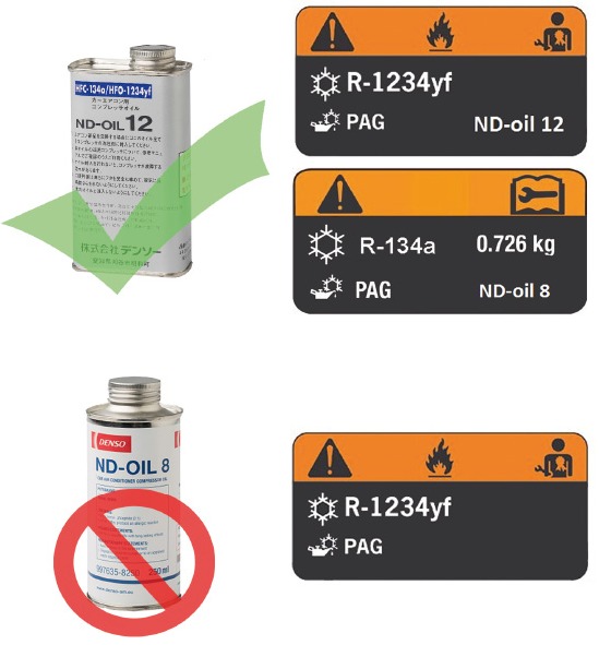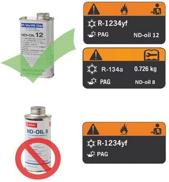 Oleje ND-8 i ND-12 nie są wzajemnie wymienne. Chociaż olej ND-12 może być używany zarówno z czynnikiem R134a, jak i R1234yf, to jednak olej ND-8 nie może być stosowany z czynnikiem chłodniczym typu R1234yf.