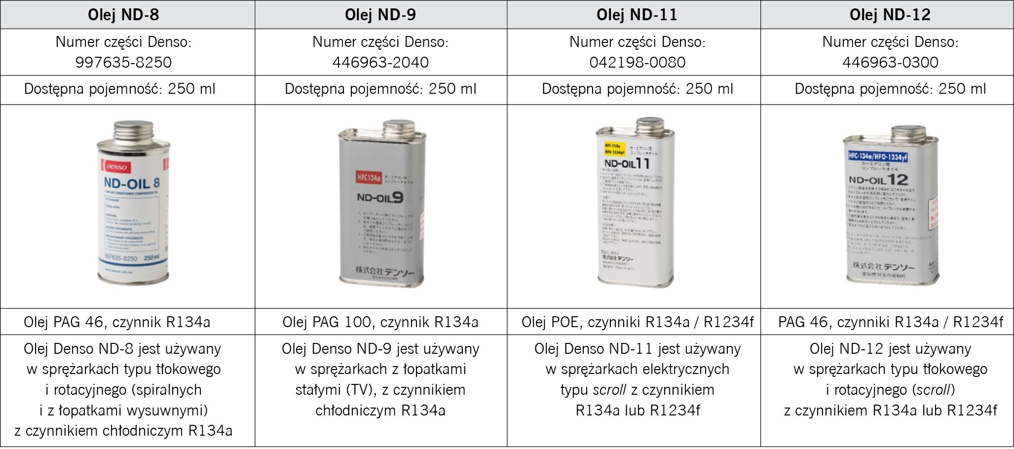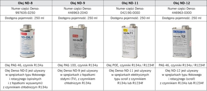 W poniższej tabeli przedstawione zostały różne typy olejów stosowane w poszczególnych sprężarkach Denso oraz przypisane do nich, dostępne na rynku wtórnym czynniki chłodnicze typu R134a lub R1234yf.