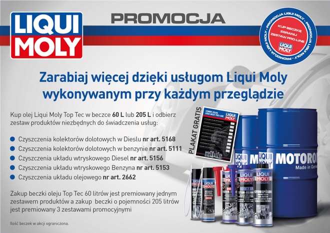 Liqui Moly wznawia też akcję promocyjną oleju Top Tec w beczkach o pojemności 60 i 205 litrów. Do każdej zakupionej beczki dodawany jest zestaw 5 produktów (5111, 5168, 5153, 5156, 2662), dzięki którym można wyczyścić układ wtryskowy, układ smarowania i układ dolotowy.
