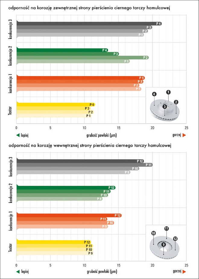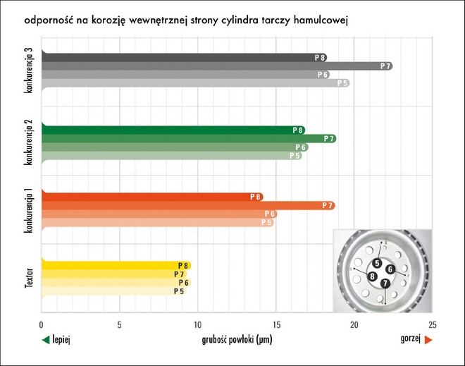 Powlekane tarcze hamulcowe Textar porównano z produktami trzech konkurencyjnych marek o podobnej jakości OE. Wszystkie zanurzono na 96 godzin w pięcioprocentowym roztworze soli fizjologicznej. Badania laboratoryjne wykonano w 20 punktach kontrolnych wyznaczonych na powierzchni każdej tarczy. Cztery z nich znalazły się po wewnętrznej stronie cylindra tarczy na styku z piastą koła. Osiem kolejnych usytuowano na wewnętrznej i zewnętrznej powierzchni pierścienia ciernego. W przypadku widocznych w samochodzie fragmentów zamontowanej tarczy ich wygląd jest ważny dla kierowców używających felg ze stopów lekkich.