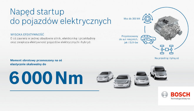 E-osie są napędem startup dla samochodów elektrycznych – także u uznanych producentów samochodów. Pozwala im zaoszczędzić cenny czas na konstruowaniu i umożliwia znacznie szybsze wprowadzanie pojazdów elektrycznych na rynek. Bosch dostosowuje układ napędowy do wymagań każdego producenta, w związku z tym klienci nie muszą już tracić czasu na opracowywanie nowych elementów. Prototypowe osie elektryczne są już testowane z klientami. Rozpoczęcie produkcji seryjnej jest planowane na rok 2019. Już teraz Bosch ma opracowaną globalną koncepcję elastycznej produkcji tych komponentów. Gwarantuje ona, że każdy klient otrzyma indywidualne rozwiązanie, które można szybko zintegrować z procesem produkcyjnym.