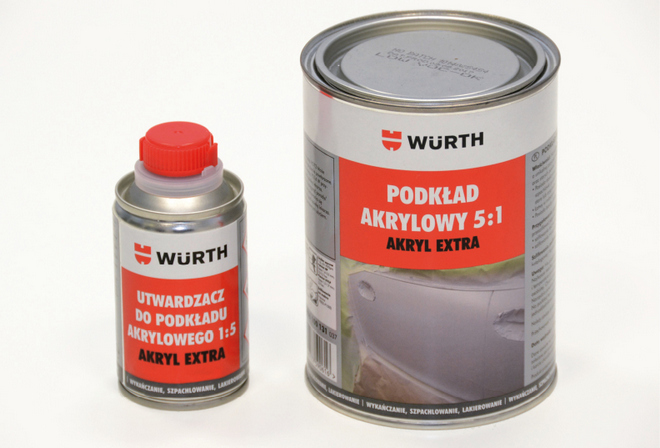 Po szpachlowaniu, ale przed nałożeniem lakieru bazowego, na naprawiany element należy nanieść odpowiedni podkład. Würth Polska oferuje podkład wypełniająco-izolujący Akryl Extra w kolorze szarym z utwardzaczem (art. nr 5866 100 131) i rozcieńczalnikiem (nr art. 0823410001). Podkład ten wyróżnia doskonała przyczepność do stali ocynkowanej. Posiada on również bardzo dobrą przyczepność do stali czarnej, aluminium, szpachlówek poliestrowych oraz podkładów epoksydowych, podkładów reaktywnych oraz do dobrze przeszlifowanych starych lub oryginalnych powłok lakierniczych. Jest łatwy w mieszaniu i aplikacji. Po natryśnięciu pozostaje stabilny na pionowych powierzchniach.