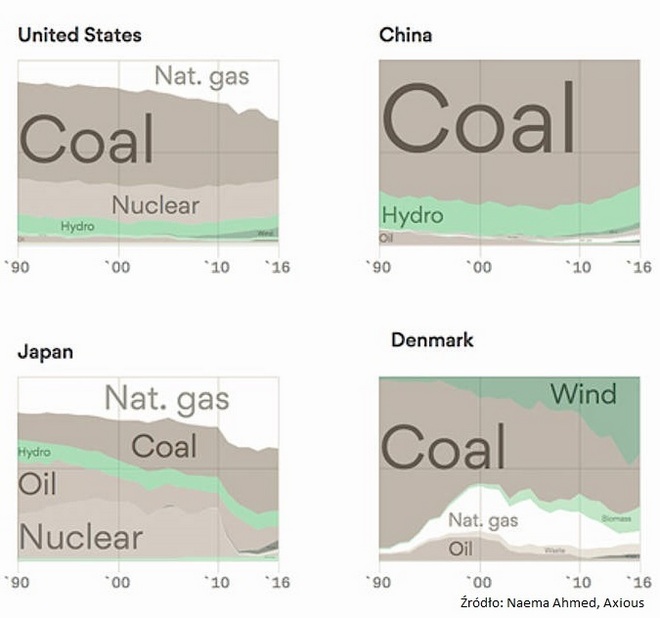 Nie jest to nic zaskakującego, ponieważ niemiecka sieć elektryczna jest w dużej mierze uzależniona od węgla. Poniższy wykres przedstawia udział całkowitej produkcji energii elektrycznej z różnych źródeł w USA, Chinach, Japonii i Danii.