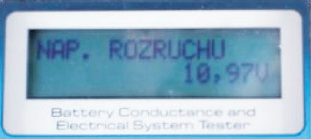 Badany jest poziom, do jakiego spada napięcie podczas rozruchu silnika. Badanie to jest uzupełnieniem podstawowego testu akumulatora. Tester sprawdza, do jakiego poziomu spada napięcie podczas rozruchu silnika. Wyniki należy interpretować w następujący sposób: