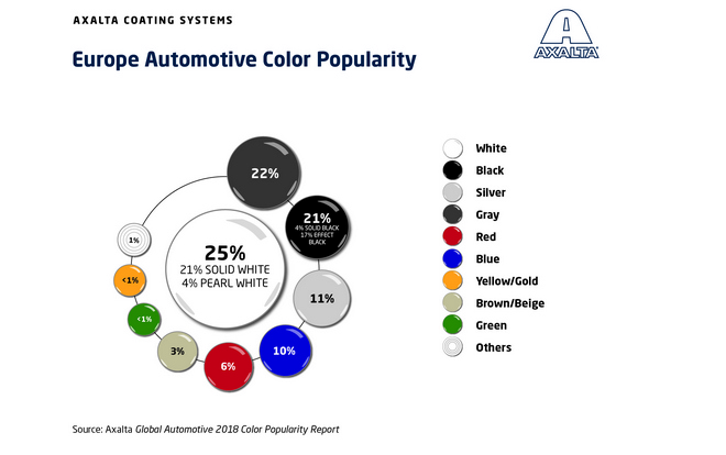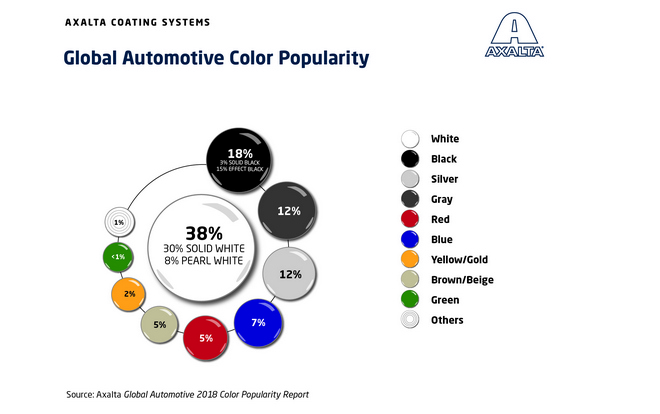 W 2018 r. wśród barw samochodów dominowała biel (38%). Drugie miejsce zajęła czerń (18%), natomiast trzecie – kolory szary i srebrny (po 12%).