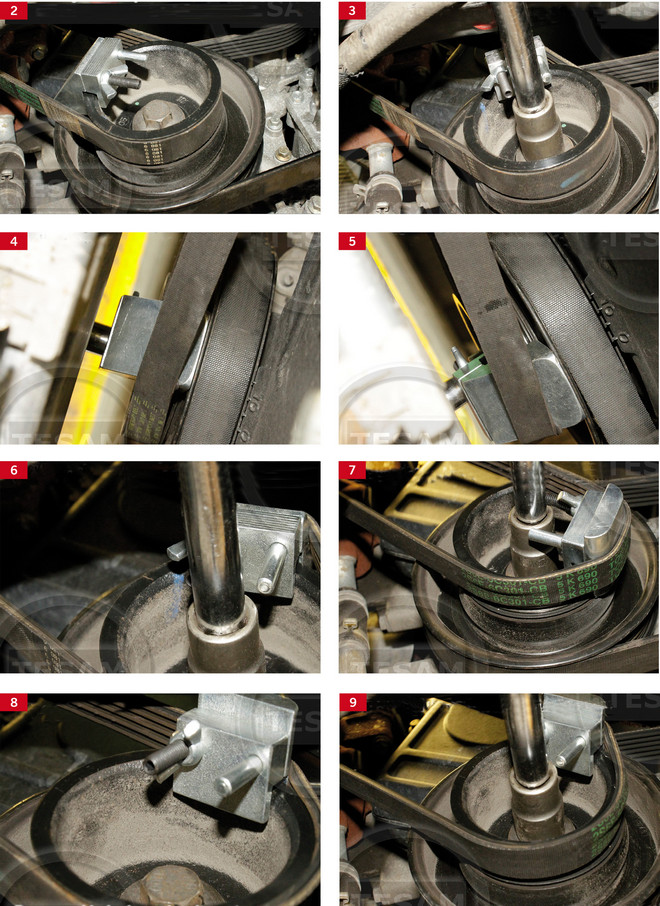 Naprężenie paska niezbędne do jego demontażu powoduje w trakcie obrotu koła pasowego zewnętrzny adapter przyrządu, wciskający się pomiędzy pasek a obwód koła pasowego (rys. 4). W dalszej fazie obrotu skośna część adaptera zsuwa uniesiony pasek z obwodu koła pasowego (rys. 5). Czynność ta pokazana od strony czołowej koła widoczna jest na kolejnym zdjęciu (rys. 6).