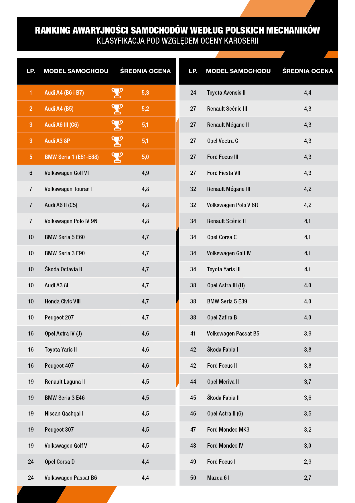 Na 4,3 w 6 stopniowej skali polscy mechanicy oceniają stan karoserii samochodów trafiających do warsztatów – wynika z „Rankingu awaryjności samochodów według polskich mechaników” opracowanego przez markę ProfiAuto. Jest dobrze, ale mogłoby być lepiej – podkreślają specjaliści. Najsłabsza ocena w rankingu to 2,7 (Mazda 6 I); najlepsze modele zdobyły notę przewyższającą „szkolną” piątkę (5,3 w przypadku Audi A4 B6 i B7).
