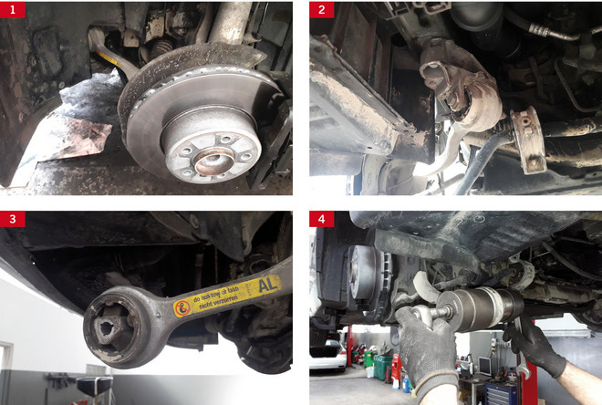 9 Wahacz montuje się ponownie w mocowaniu i wstępnie przykręca. Dokręcanie powinno się odbywać zgodnie ze specyfikacją producenta pod obciążeniem, czyli gdy pojazd stoi na kołach. Jeśli warsztat nie posiada kanału lub podnośnik nie daje możliwości podniesienia pojazdu na kołach, można wykorzystać podnośnik dodatkowy. Następnie montuje się zdemontowane wcześniej zaślepki oraz dolną osłonę silnika.