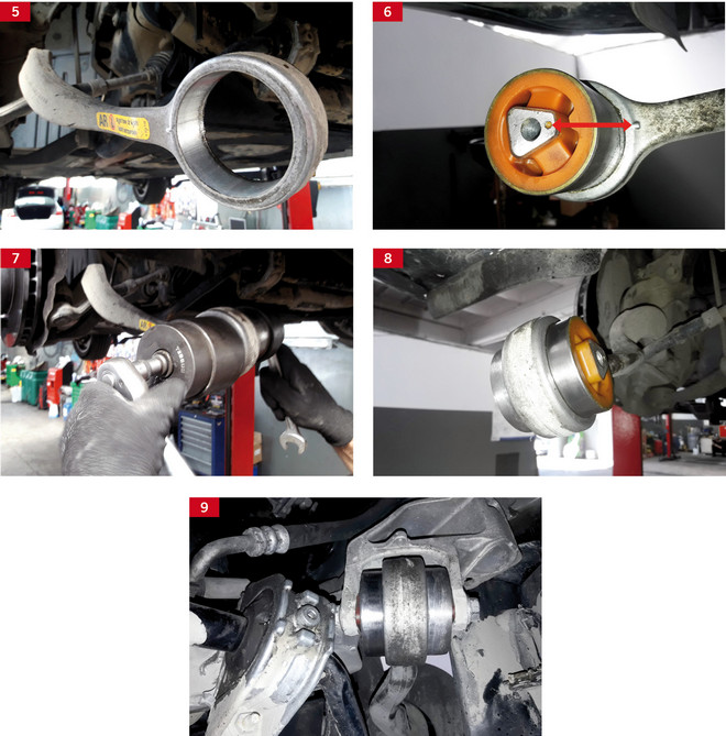 5 Przed montażem tulei należy dokładnie oczyścić gniazdo wahacza oraz jego okolice. Jeżeli gniazdo jest uszkodzone, trzeba wymienić cały wahacz. Warto również sprawdzić za pomocą suwmiarki średnicę tulei oraz samego wahacza.