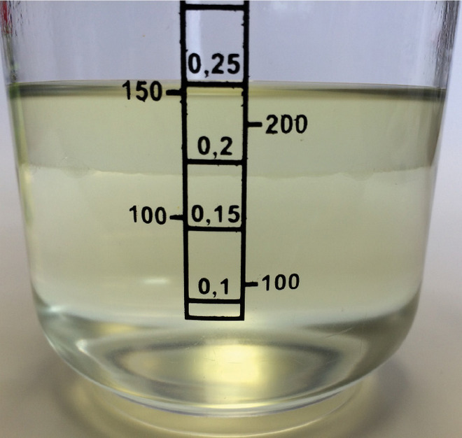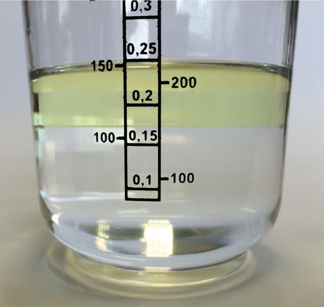 Olej PAG (lepkość 46 – dolna warstwa) oraz nalany na niego olej PAO 68 (lepkość 68 – górna warstwa)