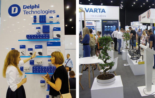 Z lewej: ekspozycja Delphi technologies pozwoliła zwiedzjącym zapoznać się ze zmianą identyfikacji wizualnej produktów. Z prawej: Varta – marka firmy Clarios (wcześniej należąca do Johnson Controls) – przedstawiła m.in. akumulatory do systemów start&stop