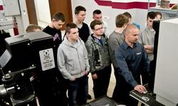 Uczniowie II klasy Zespołu Szkół Mechanicznych w Elblągu zapoznają się z technologiami cięcia wodą.