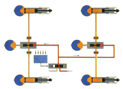 - z. hydropneumatyczne (ang. hydro-pneumatic springing) - konstrukcja, w której element sprężysty jest zastąpiony tłokiem poruszającym się w cylindrze i przetłaczającym płyn do akumulatora hydraulicznego, co poprzez odpowiednie zmiany początkowego ciśnienia w takiej "sprężynie" pozwala regulować jej sztywność i równocześnie wysokość prześwitu podwozia